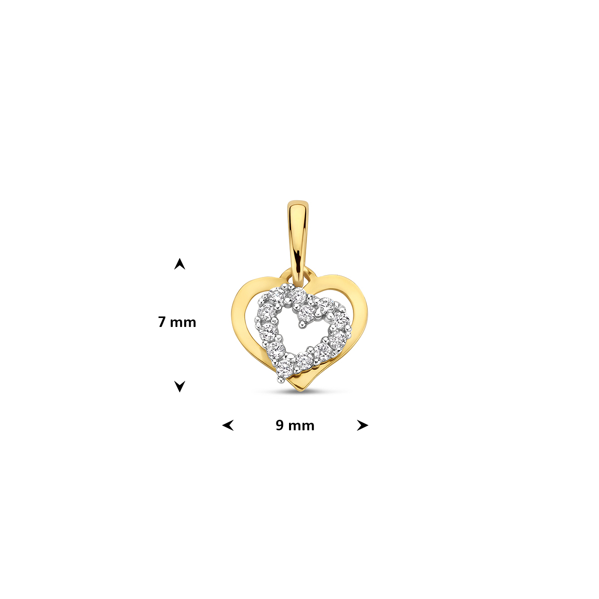 9k Bicolor wit- en geelkleurige hanger met een hart en zirkonia. Het hartje heeft een afmeting van 7x9mm.