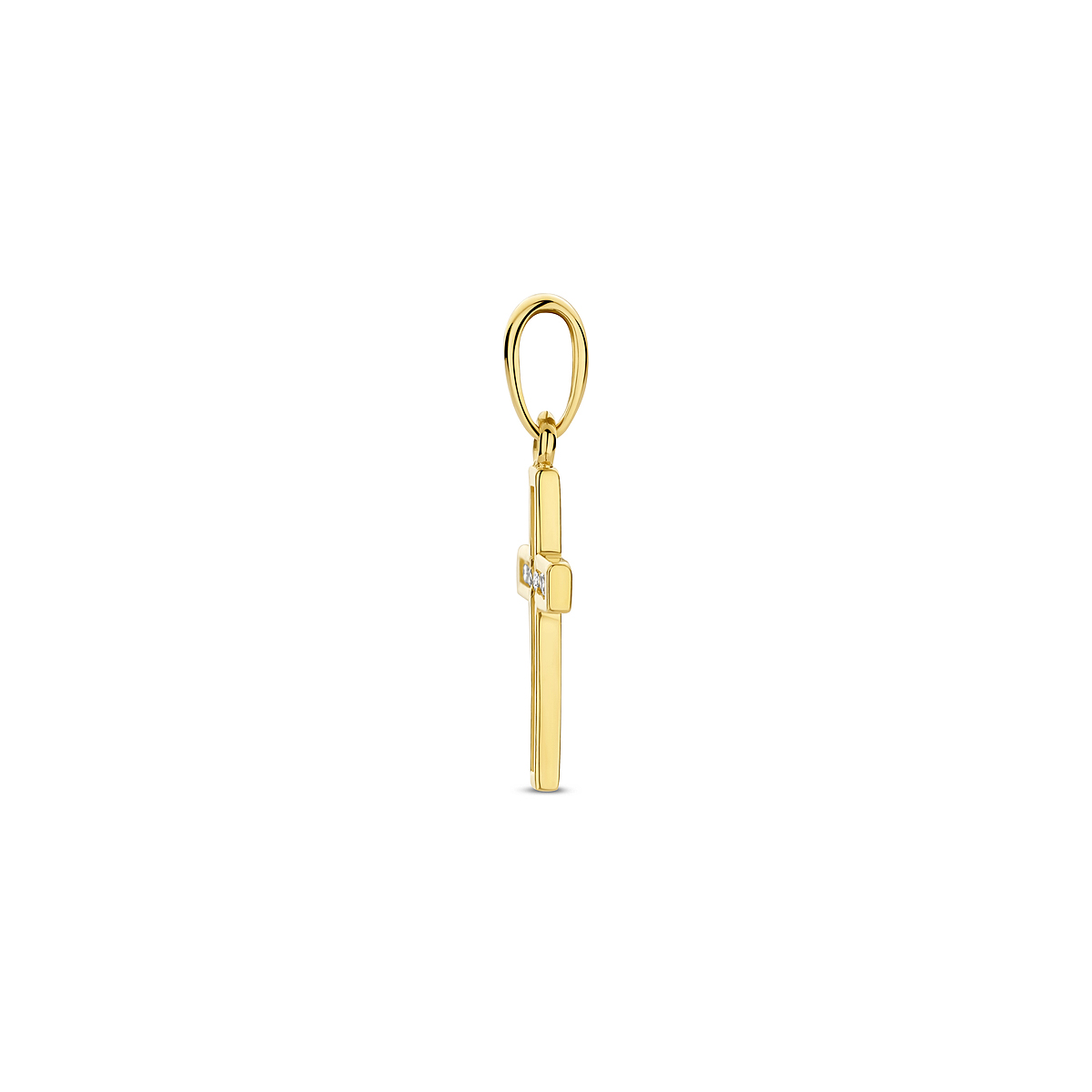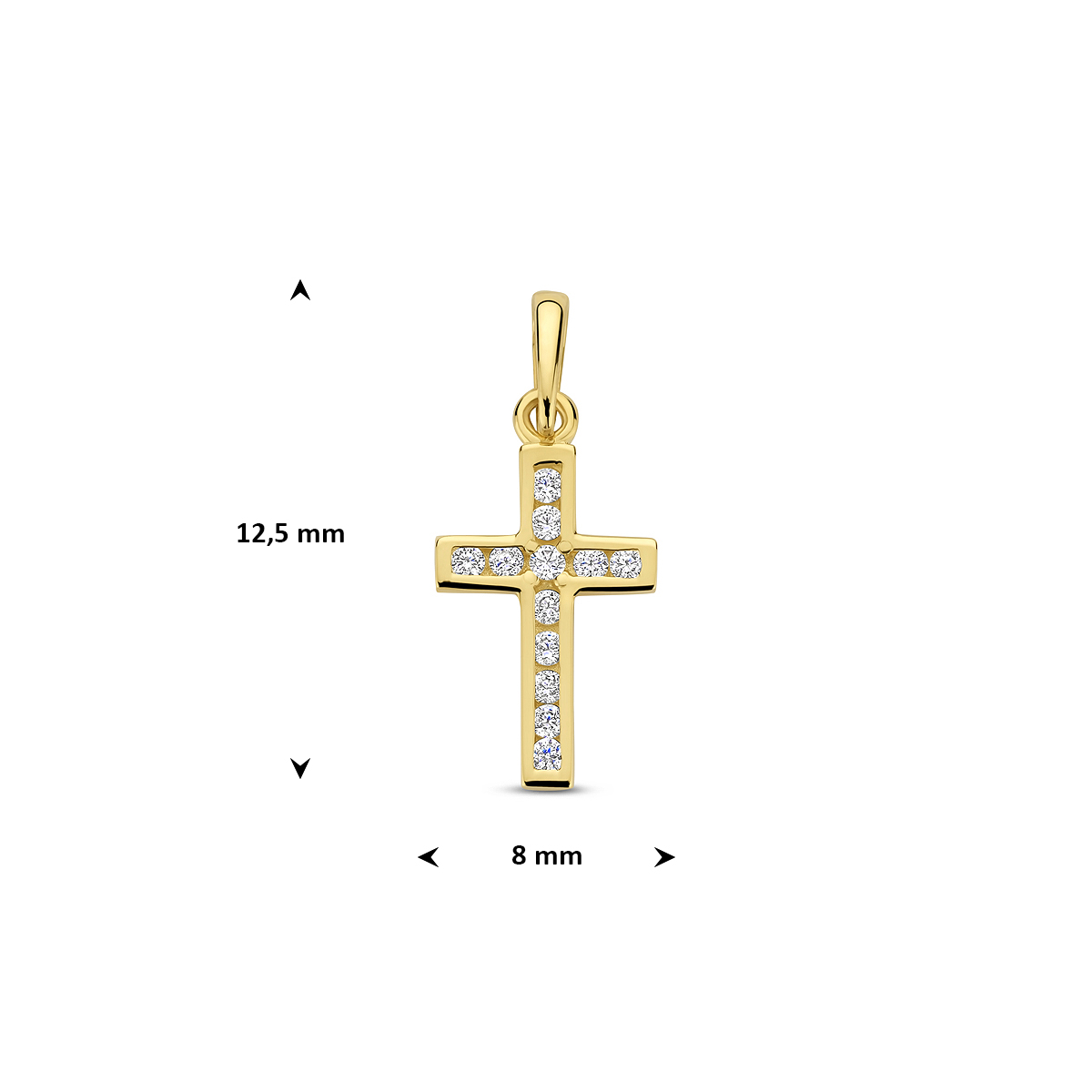 9k Geelkleurig hanger uitgevoerd in de vorm van een kruis met zirkonia. De hanger heeft een afmeting van 12.5x8mm.