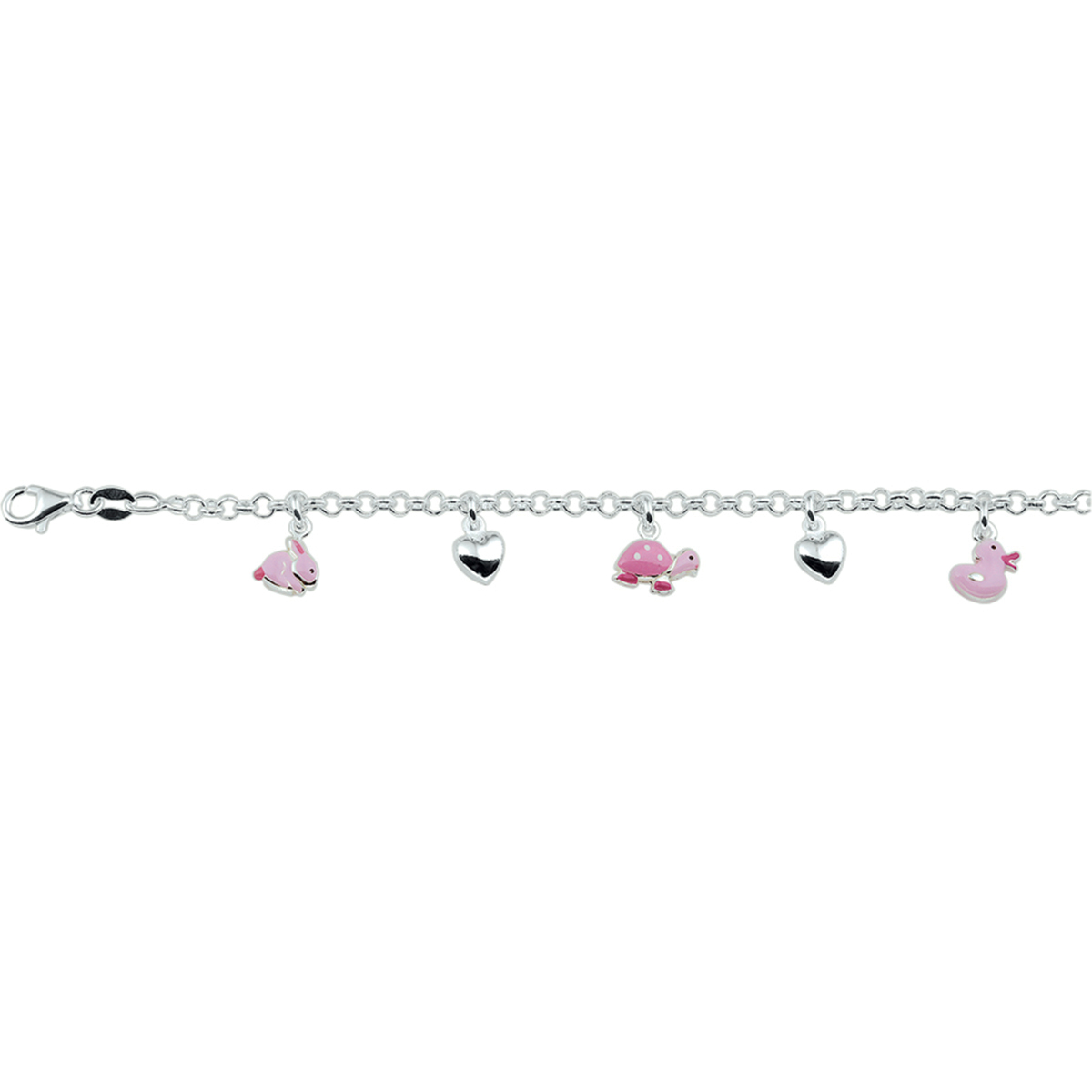 Zilveren armband met hartjes en diverse dierenbedels van roze emaille. De armband is onderdeel van een set. De lengte van de armband bedraagt 13cm met 2cm extensie. De schakelbreedte bedraagt 3.0mm.