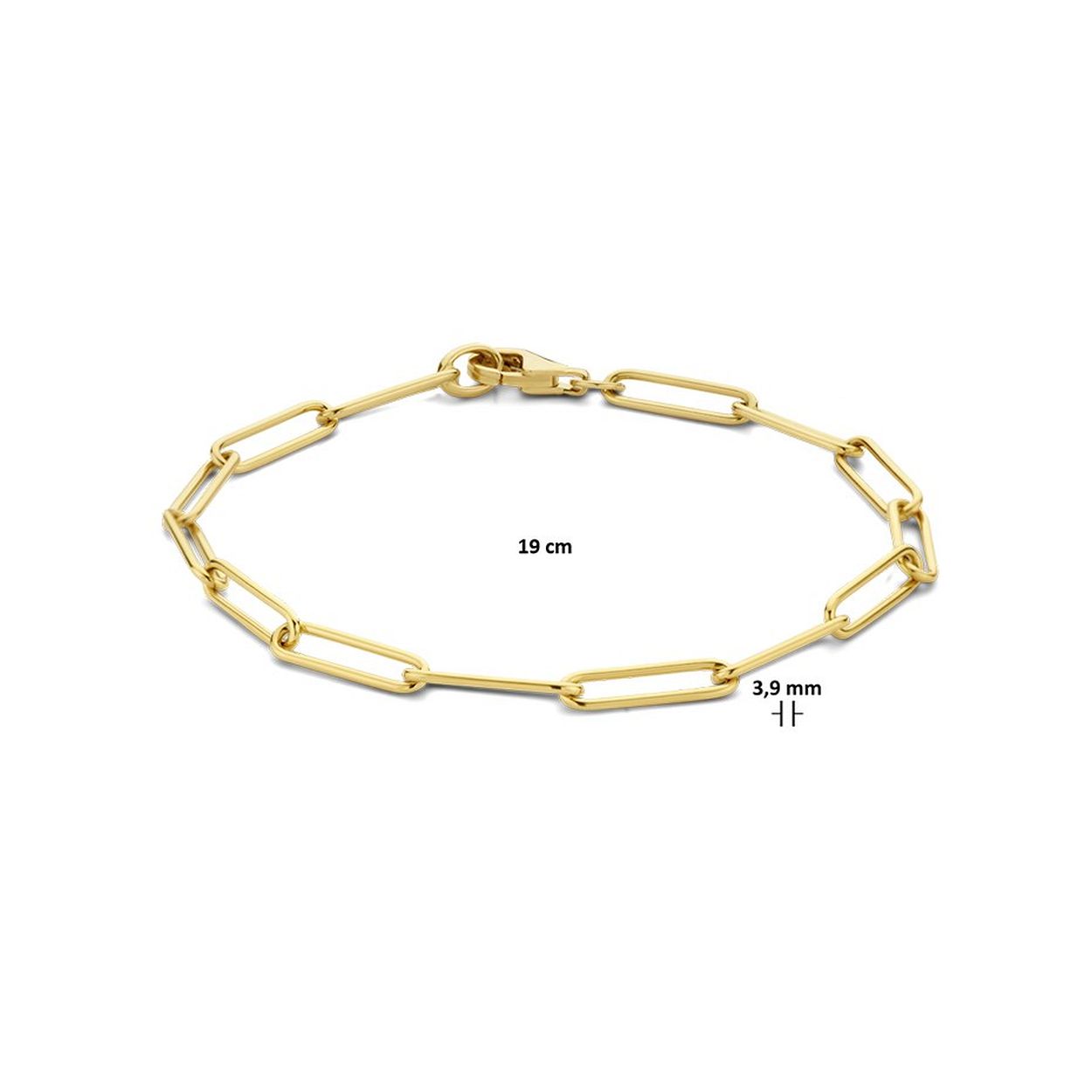 14k Geelgouden armband uitgevoerd met een paperclip schakel en een karabijnslot. De armband heeft een draaglengte van 19cm.