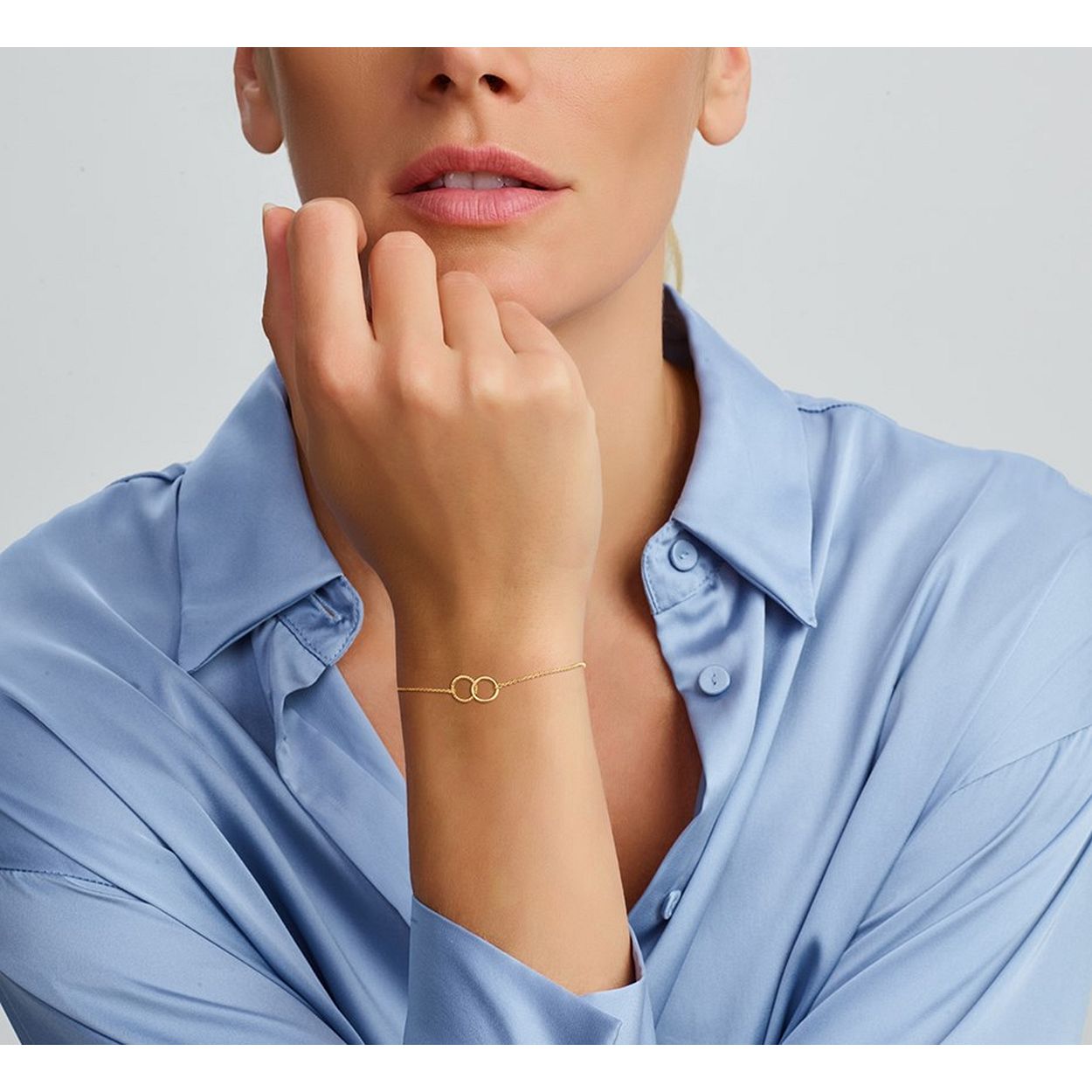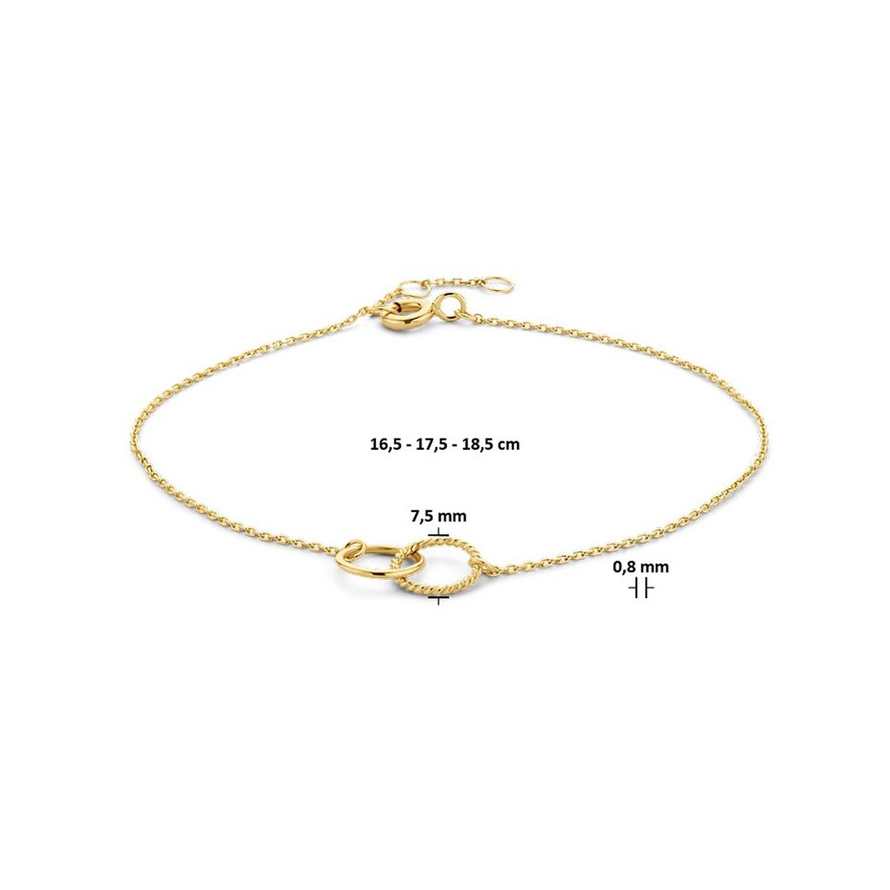 14k Geelgouden armband uitgevoerd met twee rondjes met een diameter van 7.5 mm. De armband heeft draaglengtes van 16.5, 17.5 en 18.5cm.