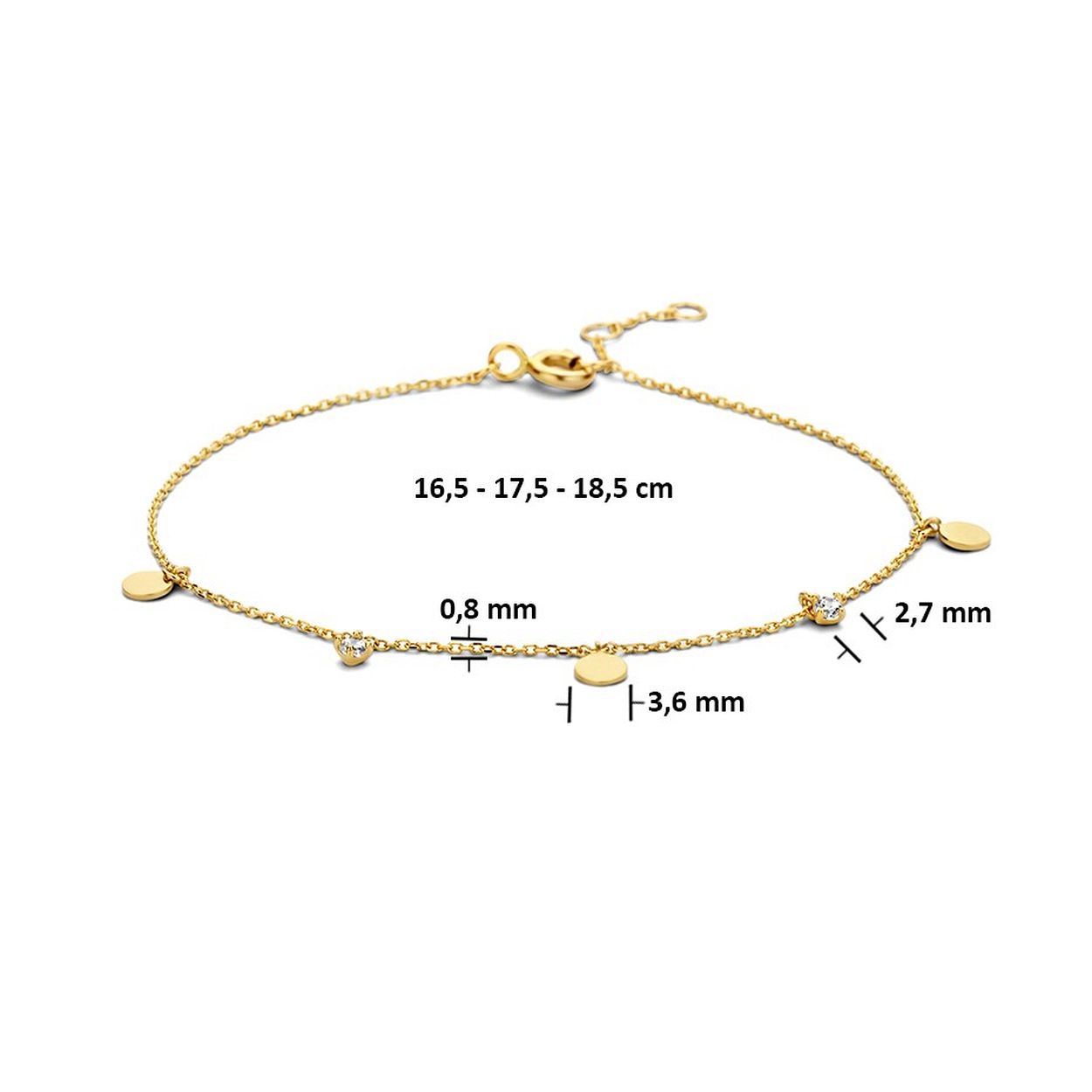 14k Geelgouden armband uitgevoerd met rondjes en zirkonia. De armband heeft draaglengtes van 16.5, 17.5 en 18.5cm.