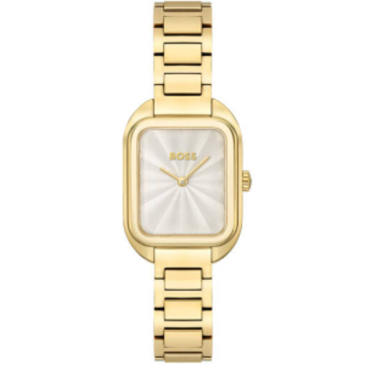 Dit BOSS horloge uit de Balley serie met artikelnr: HB1502684 heeft een stijlvolle uitstraling. Het dameshorloge heeft een goudkleurige stalen rechthoekige horlogekast met een gladde bezel en een zilverwitte wijzerplaat met hele fijne wijzers en het Boss logo. De wijzerplaat heeft een sunray textuur en dat maakt het horloge erg chique.  Aan de kast zit een goudkleurige stalenband met een vouwsluiting. De kast van het horloge heeft een afmeting van 25 bij 35mm met mineraalglas en is 3 ATM.