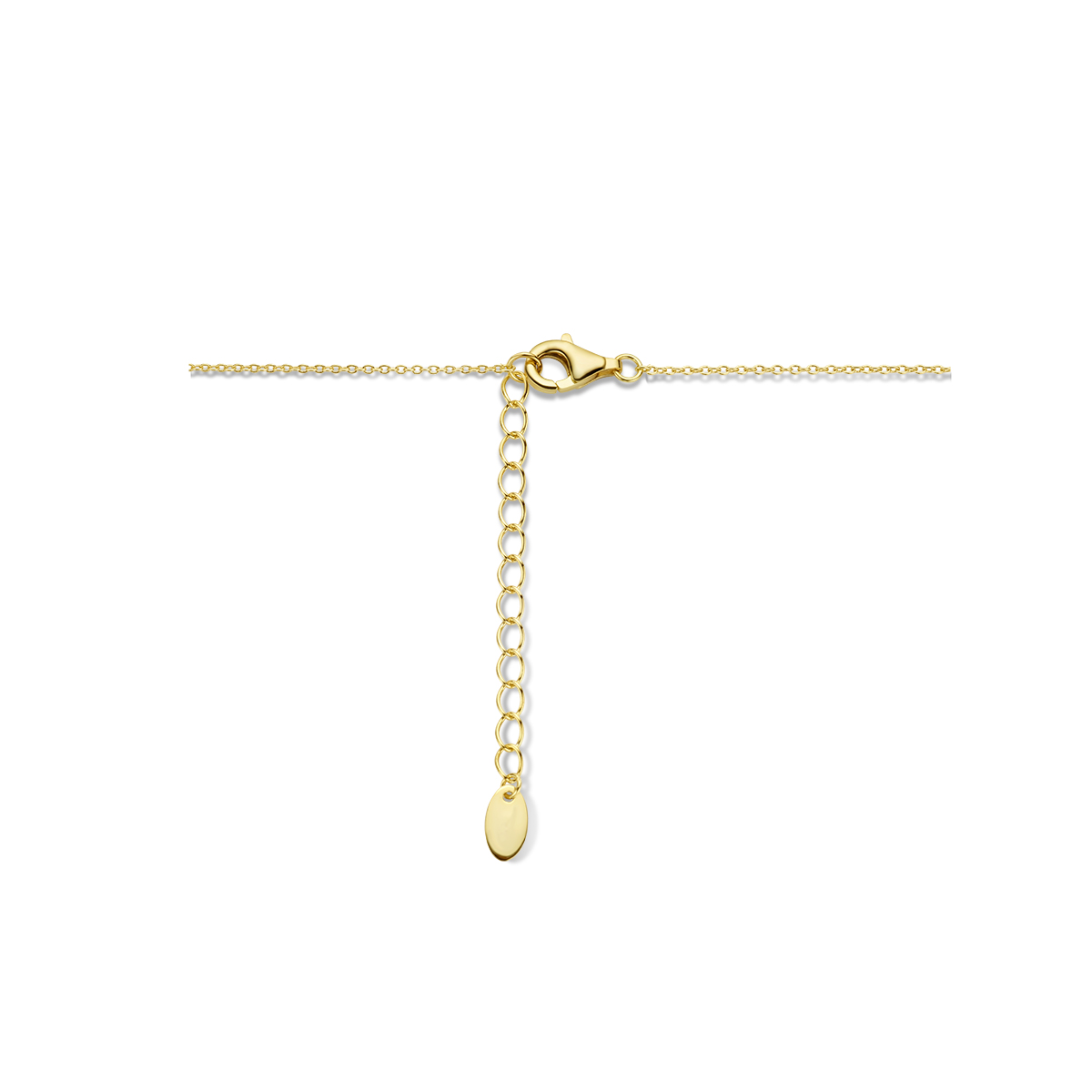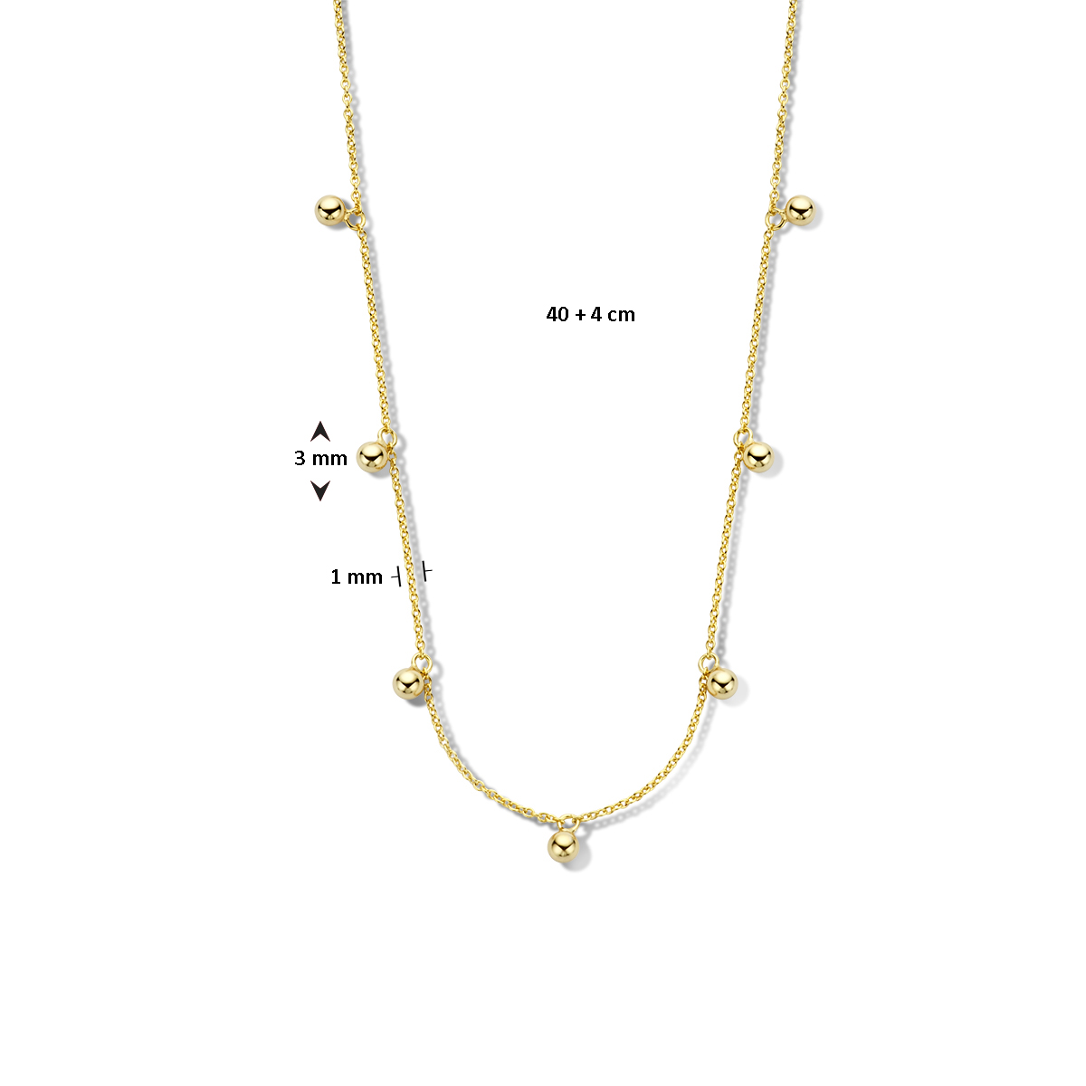 Verguld op 925 zilveren collier met bolletjes hangers. Het collier heeft een draaglengte van 40cm en een extensie van 4cm. De schakelbreedte is 1mm. Uitgevoerd met een karabijn sluiting. Geen garantie op de plating.