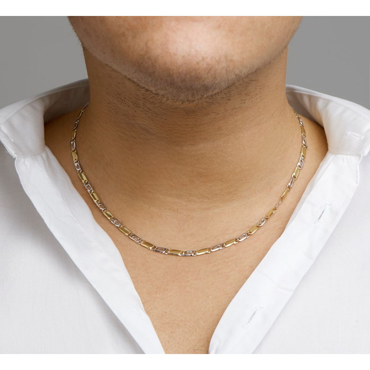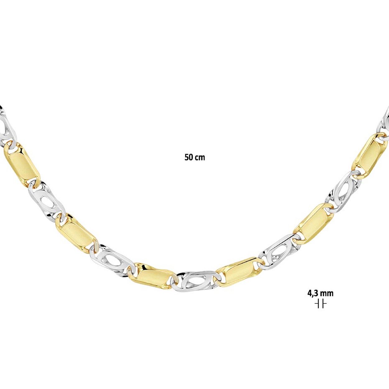 14k Bicolor wit- en geelgouden collier met een valkenoog schakel. Het collier heeft een draaglengte van 50cm en is uitgevoerd met een karabijn sluiting.