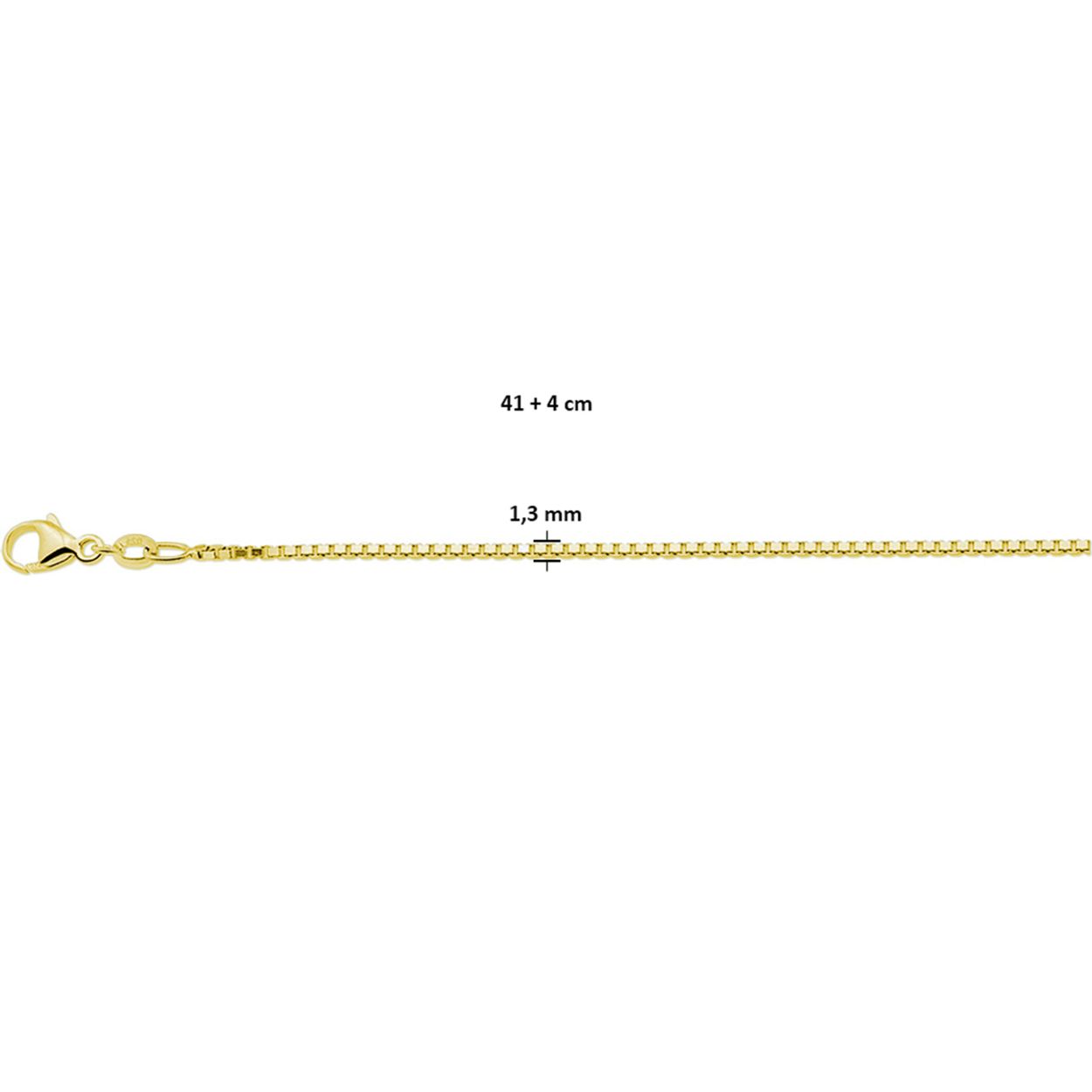 Geelgoud op 925 zilveren collier met een schakelbreedte van 1.3mm. Het collier heeft een draaglengte van 41cm en een extensie van 4cm. Uitgevoerd met een karabijn sluiting. Geen garantie op plating.