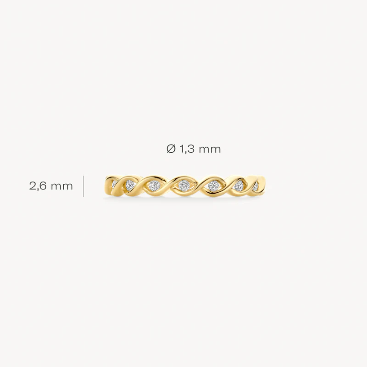 Schitterend zirkonia in een gevlochten railzetting maken deze 14k geelgouden ring tot een stijlvolle eyecatcher. De band heeft een doorsnede van 2,6 mm en de ring is prachtig te combineren met andere (aanschuif)ringen uit onze collectie.