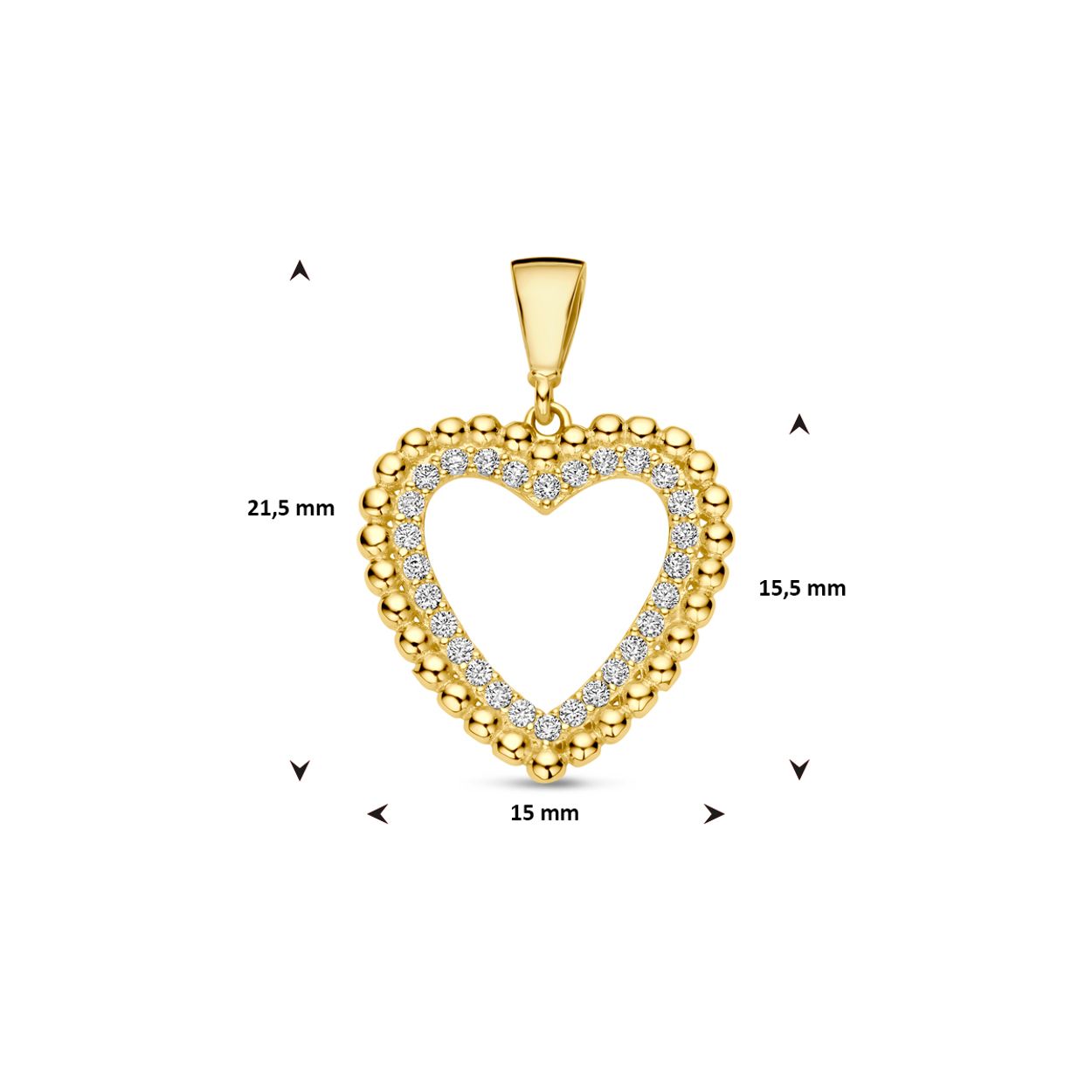14k Geelgouden hanger uitgevoerd met een hart en zirkonia. De hanger heeft een  totale hoogte van 21.5mm.