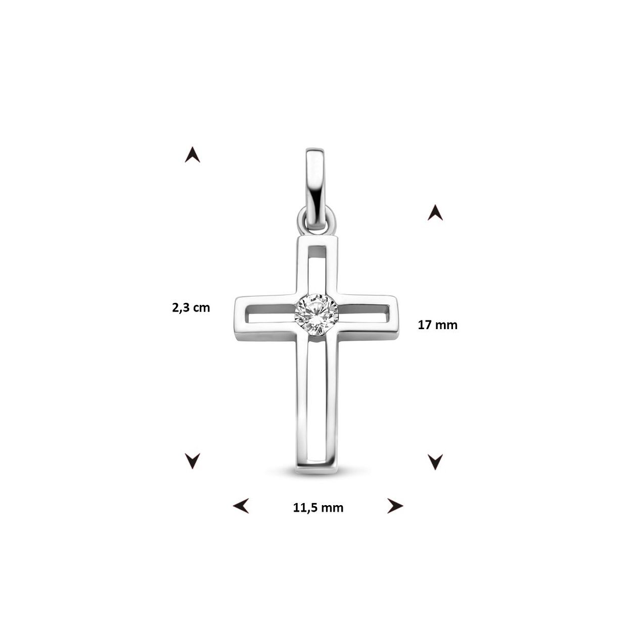 Gerhodineerd 925 zilveren hanger uitgevoerd in de vorm van een kruis met daarin een schitterende zirkonia. De hanger heeft een totale hoogte van 2.3cm en een breedte van 11.5mm.