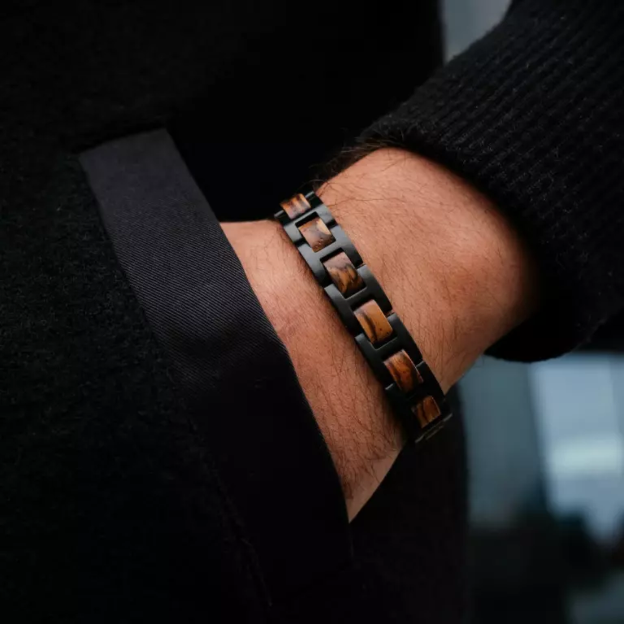 Haal uw dagelijkse oase van rust om uw pols met ons model van zebranohout en zwart roestvrij staal.