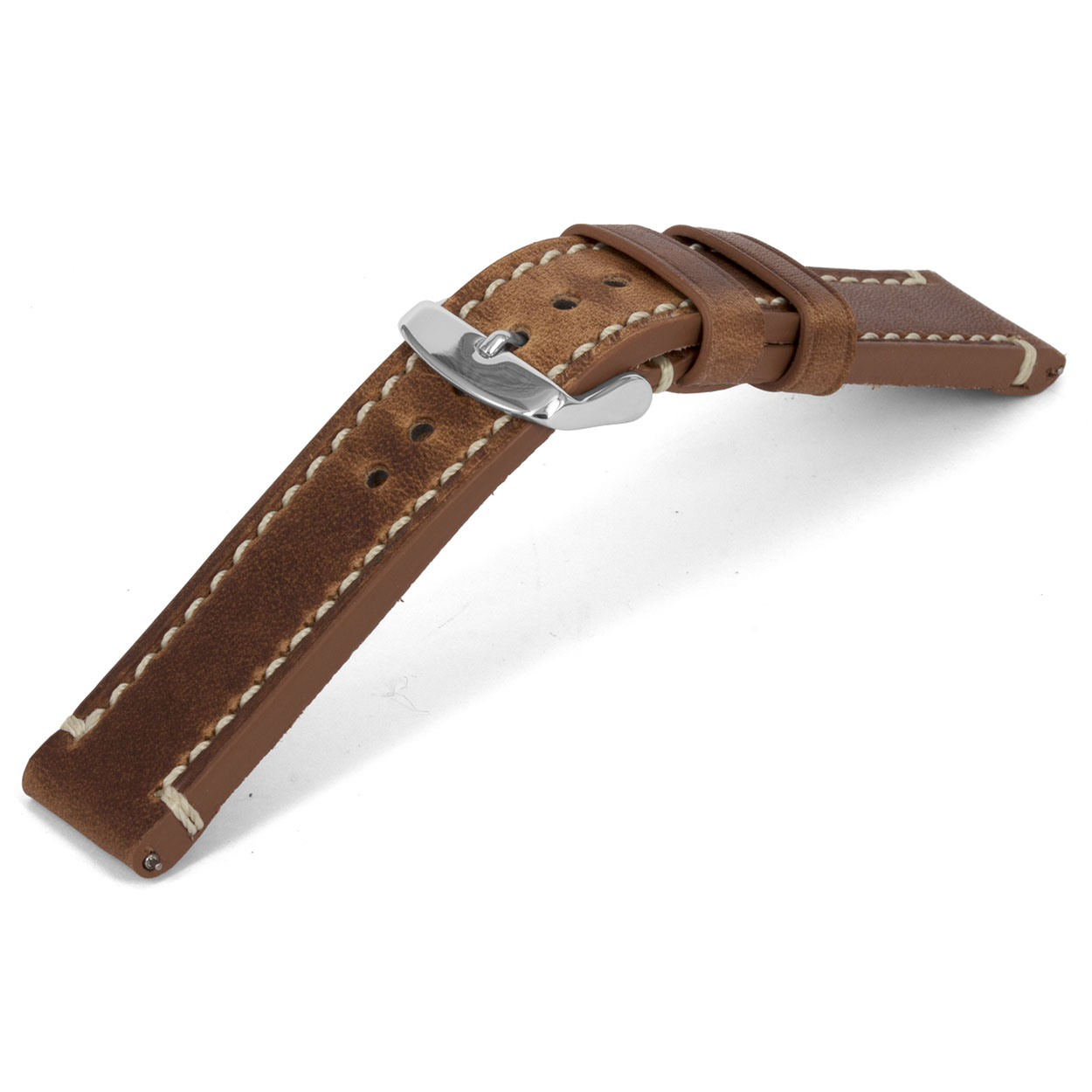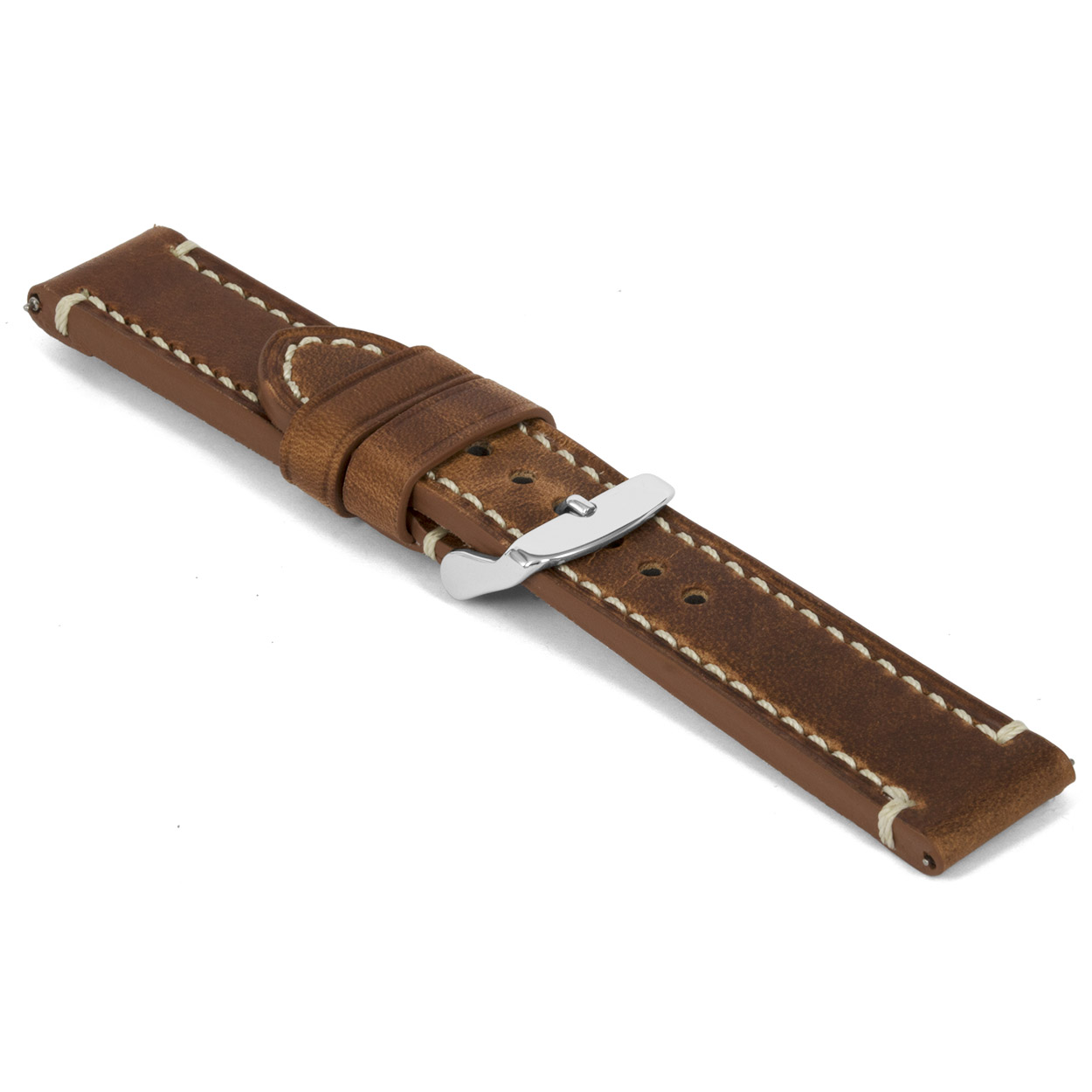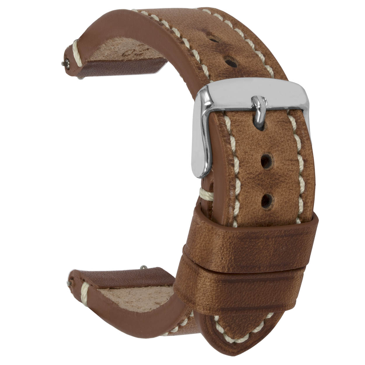 Soepele VS Cowhide lederen horlogeband, oily cognac en beige gestikt.