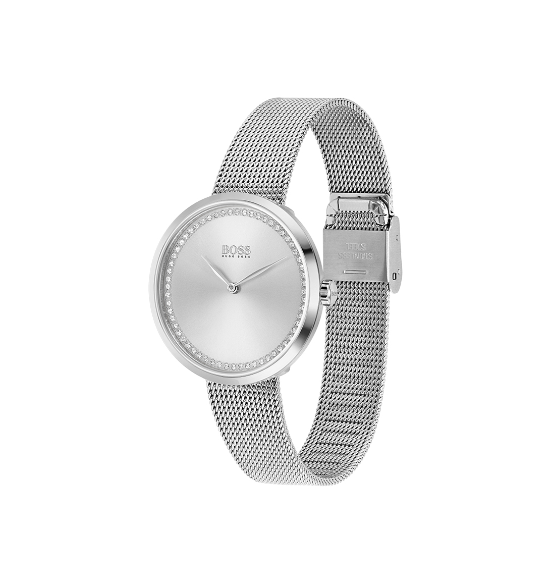 Dit prachtige dameshorloge van Hugo Boss heeft een diameter van 36 mm en is tot 30 meter waterbestendig. Het horloge heeft een zilverkleurige wijzerplaat en is afgedekt met mineraalglas. Dit horloge is van roestvrij staal met een gepolijst zilveren afwerking. De geborstelde sunray-wijzerplaat van dit horloge met twee wijzers en een minimalistisch ontworpen kast is gedecoreerd met een ring van Swarovski-kristallen. De polsband van mesh sluit met een delicate gesp, gegraveerd met het BOSS-logo.