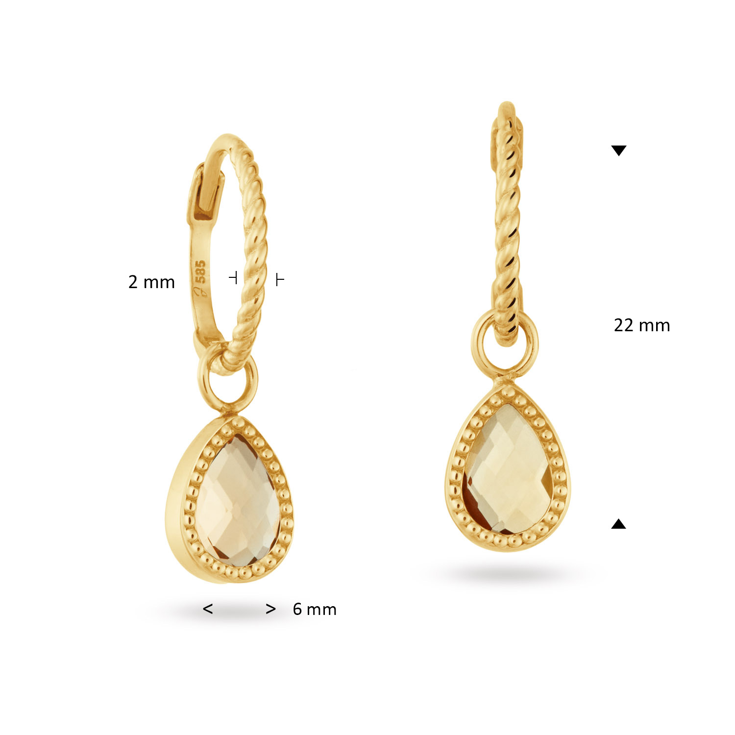 Een klassieke hanger met een echte Citrien edelsteen aan een 14 karaat gouden oorbel. Citrien staat bekend om zijn warme, citroenachtige kleur en wordt geassocieerd met eigenschappen als zelfvertrouwen en creativiteit.
