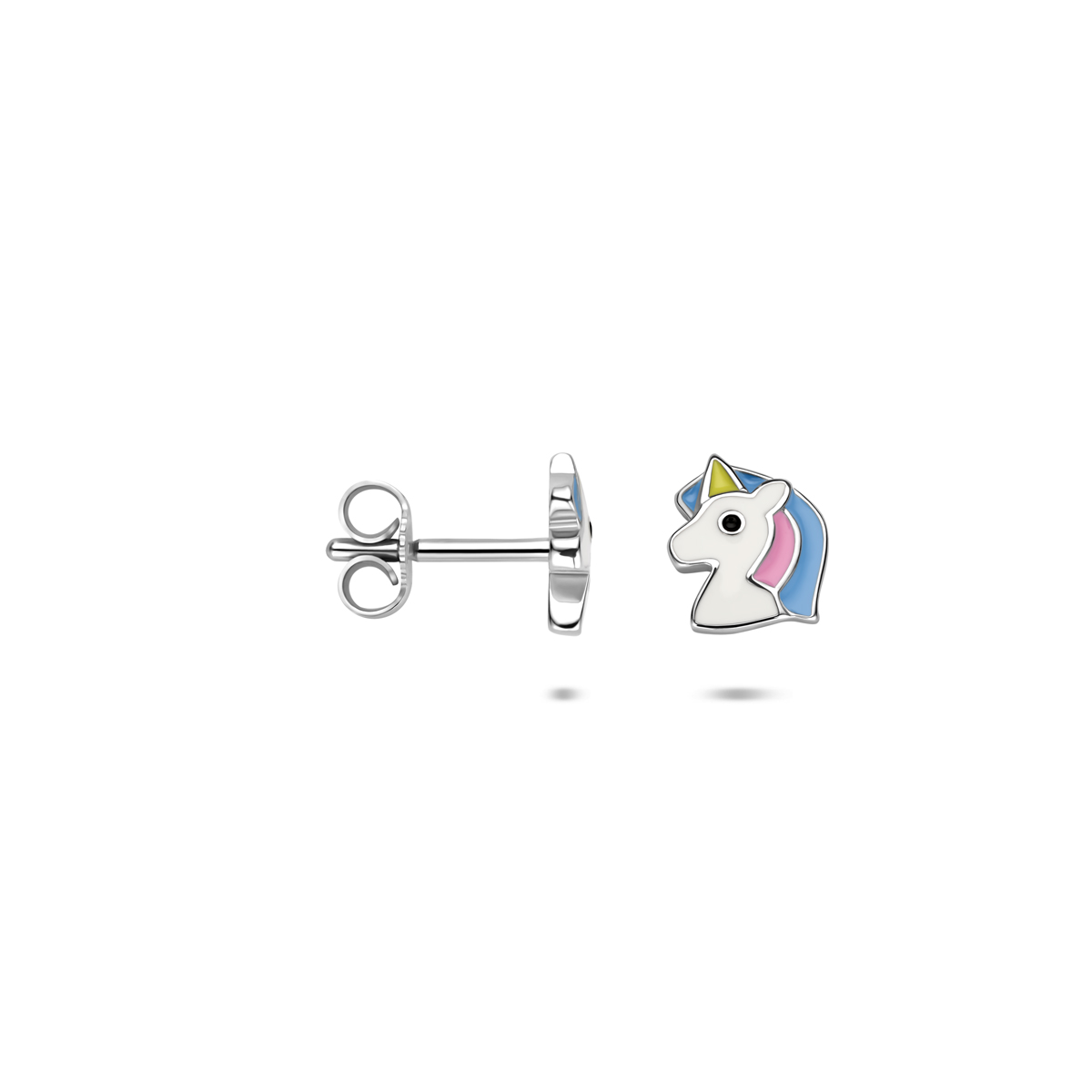 Gerhodineerd 925 zilveren oorknoppen uitgevoerd in de vorm van een emaille eenhoorn. De oorknoppen hebben een afmeting van 8x7mm.