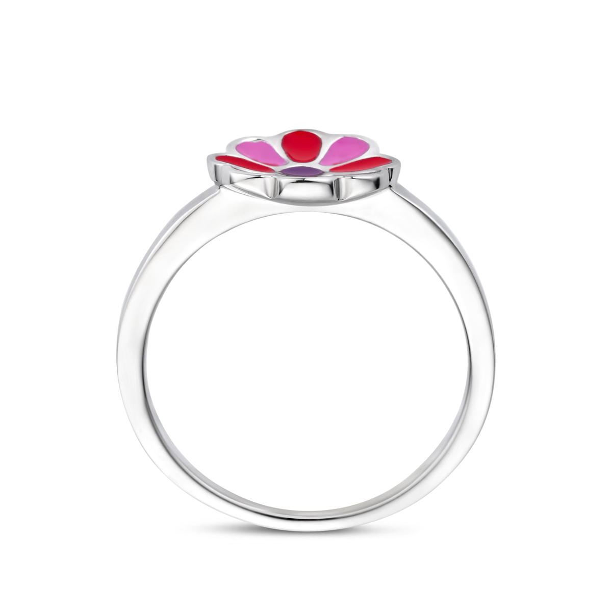 Gerhodineerd zilveren ring met een breedte van 7.5mm uitgevoerd in de vorm van een bloem in de kleuren roze rood en paarse emaille. Deze ring is te combineren met bijpassende sieraden uit onze collectie
