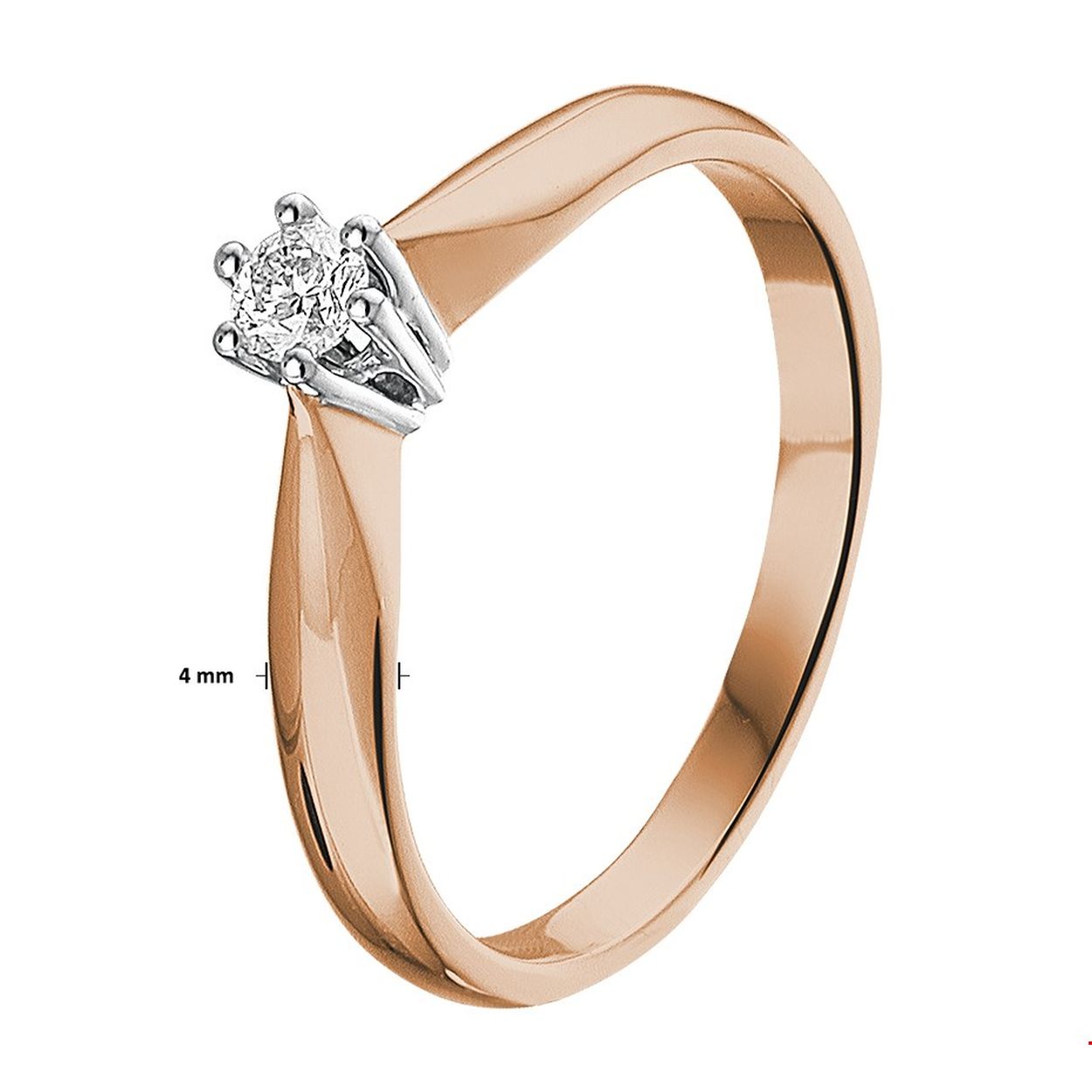 Beschrijving: Elegante bicolor wit- en rosegouden ring met een breedte van 4mm uitgevoerd met een briljant geslepen solitaire diamant van 0.10ct. in een chaton zetting. De ring is perfect te combineren met andere sieraden uit onze collectie of uit je eigen stash. Tip: Diamonds are girls best friends. Een mooi kado voor een geliefde of dierbare.