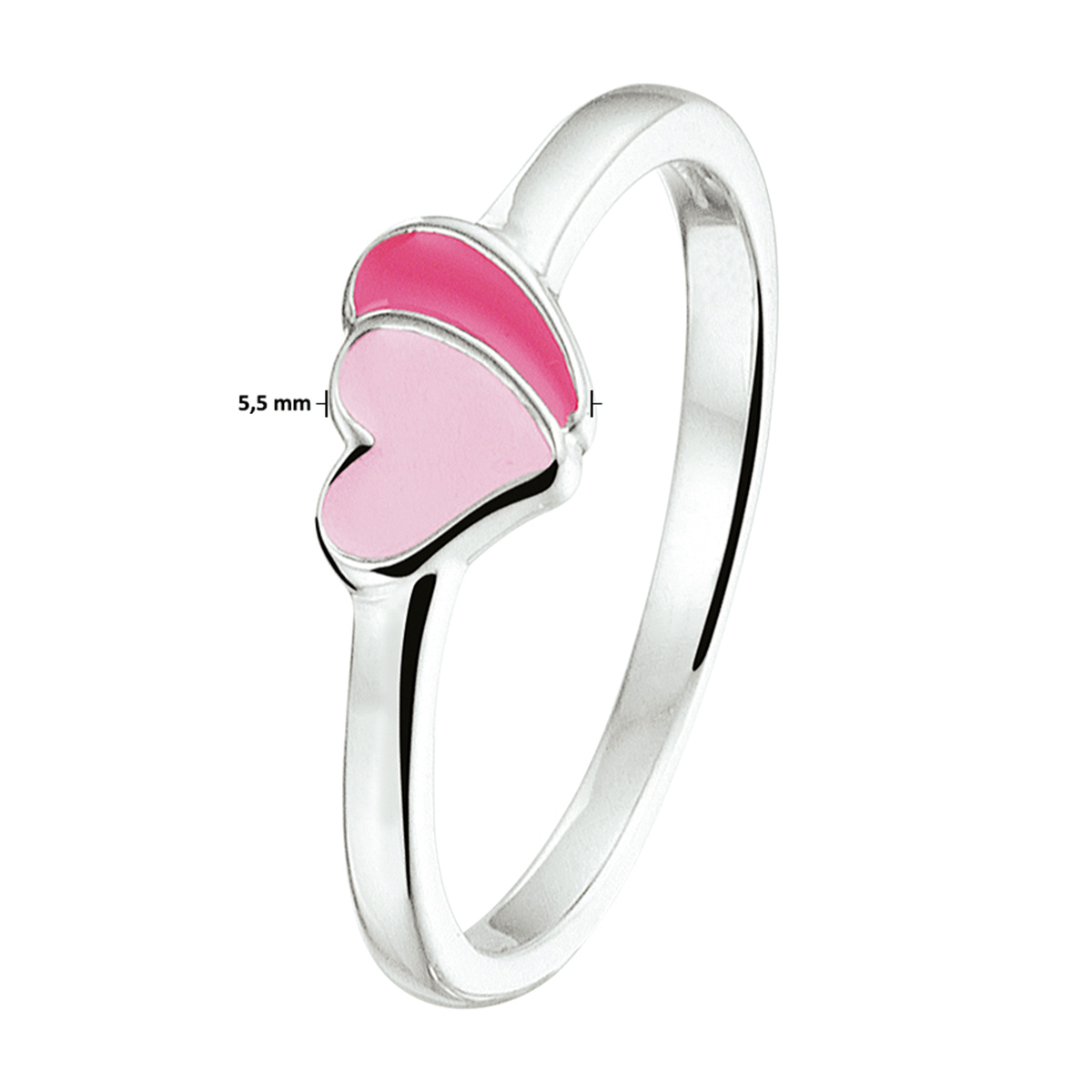 Schattige gerhodineerd zilveren hartjes ring met een breedte van 5.5mm. Uitgevoerd met roze emaille. Deze ring is perfect te combineren met bijpassende sieraden uit onze collectie. Tip: Leuk om kado te geven! Info: Gerhodineerd zilver is door de rhodiumlaag beter bestand tegen verkleuren en krassen.