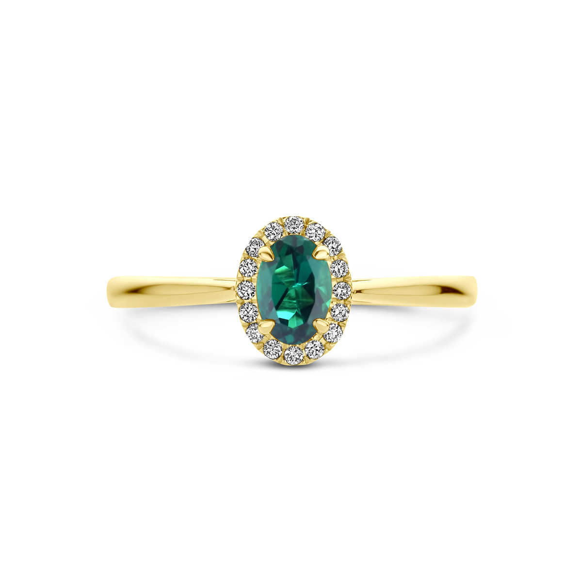 14k Geelgouden ring uitgevoerd met lab grown smaragd en lab grown diamanten. De ring heeft een afmeting van 8x6.5mm en het diamantgewicht is 0.075ct. Lab grown diamanten zijn diamanten die ontstaan in een laboratorium. Onder extreem hoge druk en temperatuur wordt het natuurlijk ontstaansproces nagebootst met als eindresultaat een diamant met dezelfde chemische eigenschappen maar met een andere oorsprong.