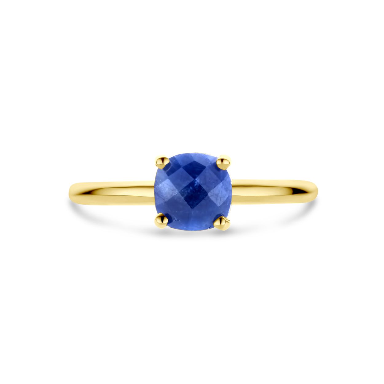 14k Geelgouden ring uitgevoerd met blauw saffier. De steen heeft een afmeting van 6x6mm.
