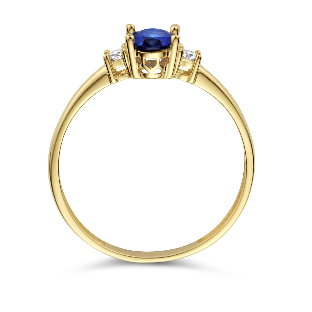 14k Geelgouden ring uitgevoerd met synthetische saffier en zirkonia. De ring heeft een breedte van 6mm.