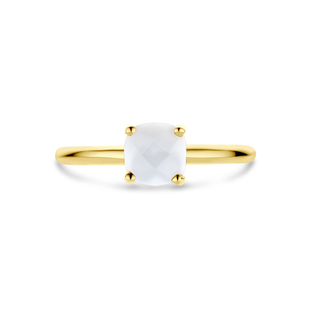 14k Geelgouden ring uitgevoerd met wit agaat. De steen heeft een afmeting van 6x6mm.