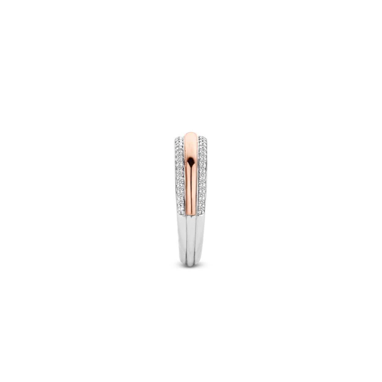 Deze zilveren TI SENTO - Milano-ring 12144ZR is verguld in rosé goud en is omringd door witte zirkonia pavé die de magie naar je toe zal brengen. Neem haar mee voor een aperitivo.