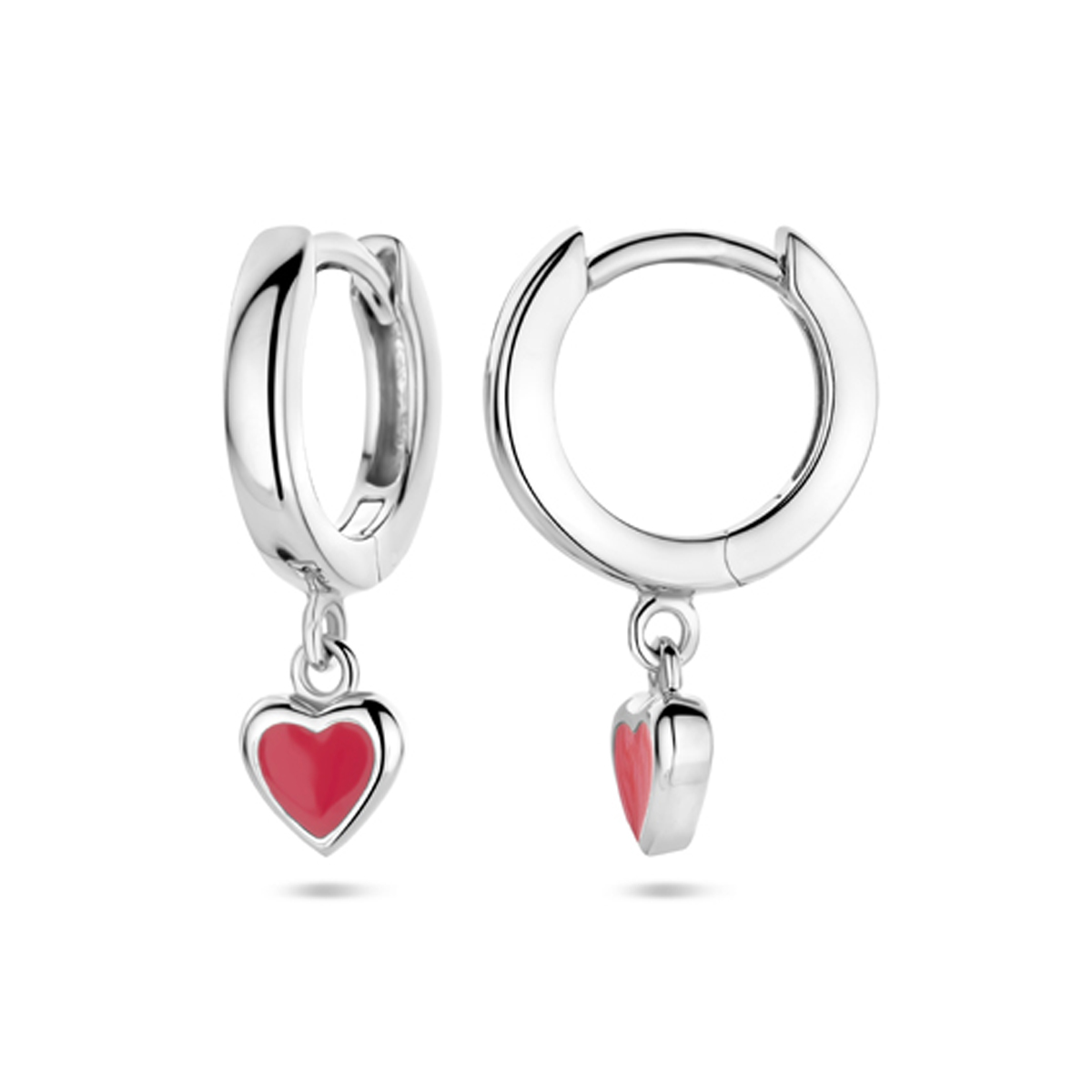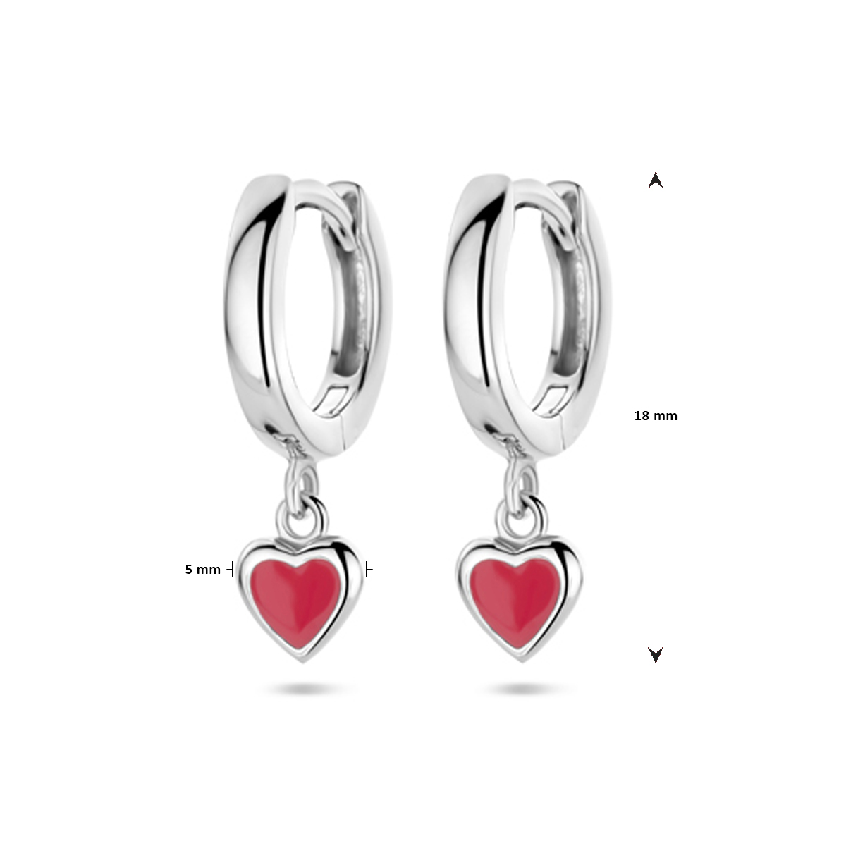 Gerhodineerd 925 zilveren klapoorringen uitgevoerd met een rood emaille hart hanger. De oorringen hebben een totale hoogte van 18mm.