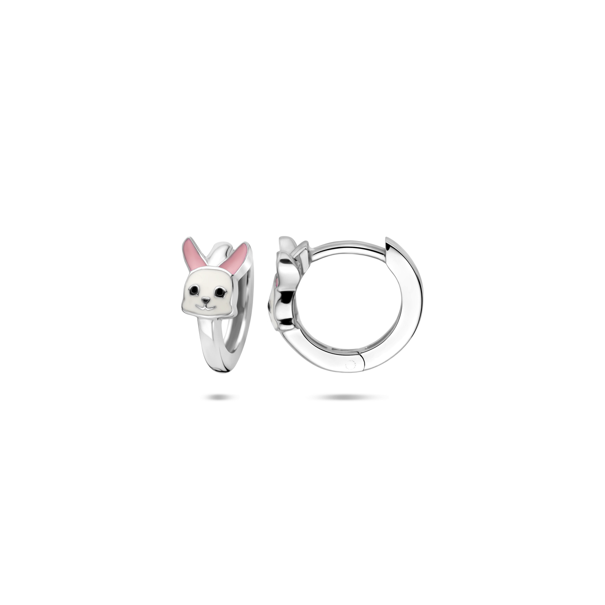 Gerhodineerd 925 zilveren klapoorringen uitgevoerd in de vorm van een emaille konijn. De klapoorringen hebben een afmeting van 10x6mm.