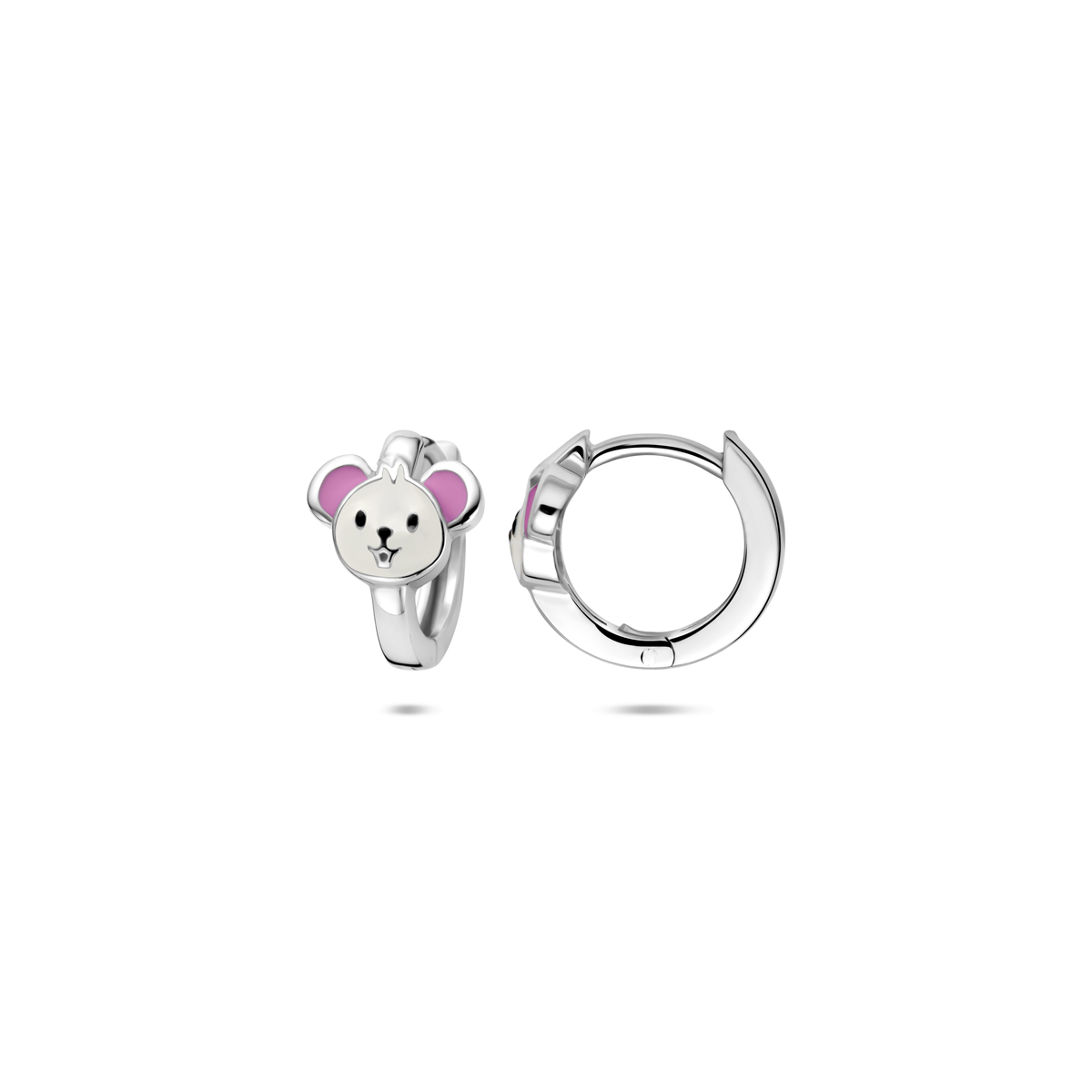 Gerhodineerd 925 zilveren klapoorringen uitgevoerd met een emaille muis. De klapoorringen hebben een afmeting van 10x8mm.