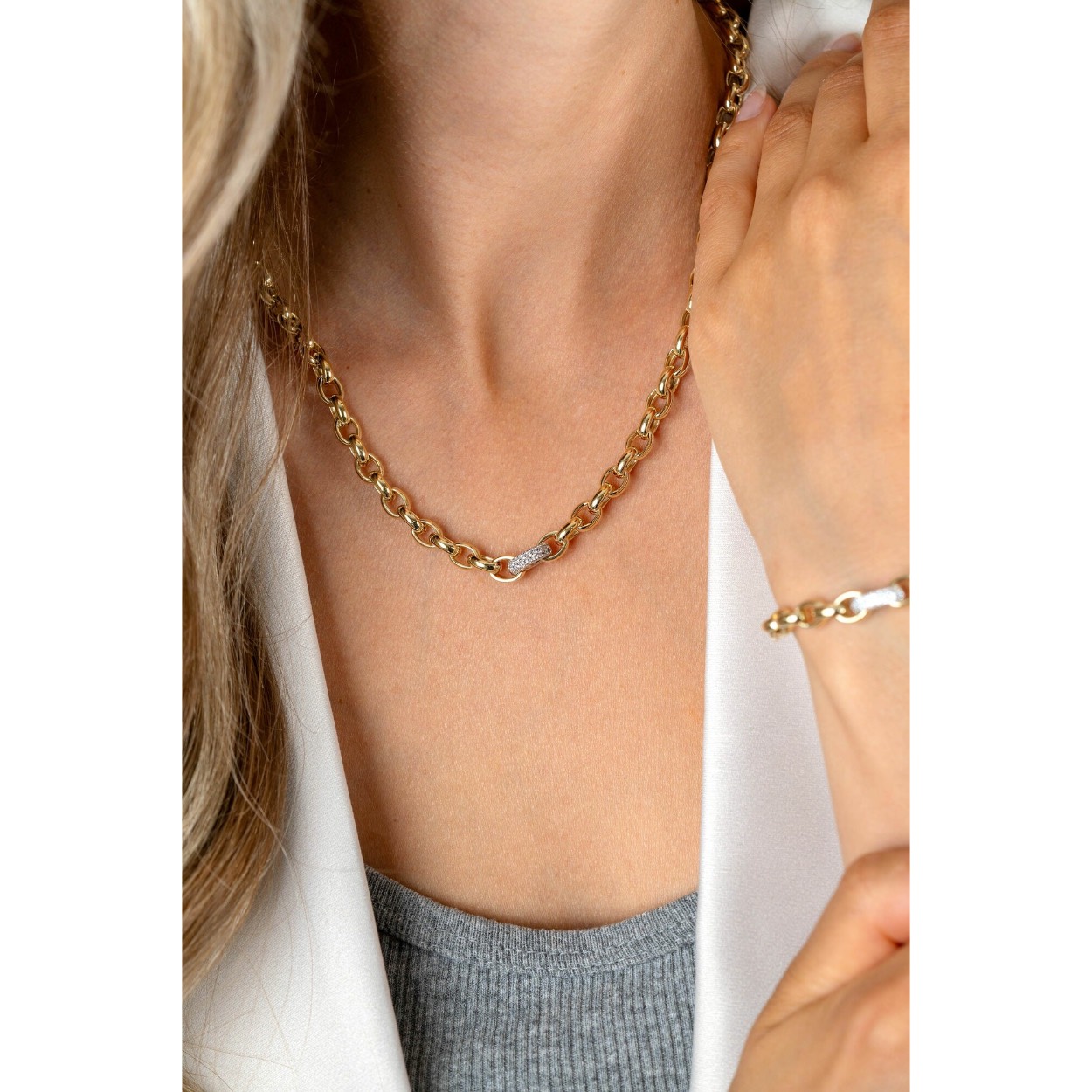 ZINZI gold plated zilveren schakelketting, waarbij een sierlijke schakel in het midden vol bezet is met witte zirkonia's. De stoere schakel is 6mm breed en de lengte van de ketting is 45cm. De ketting is vervaardigd van eerste gehalte zilver (925) en extra geel verguld.
