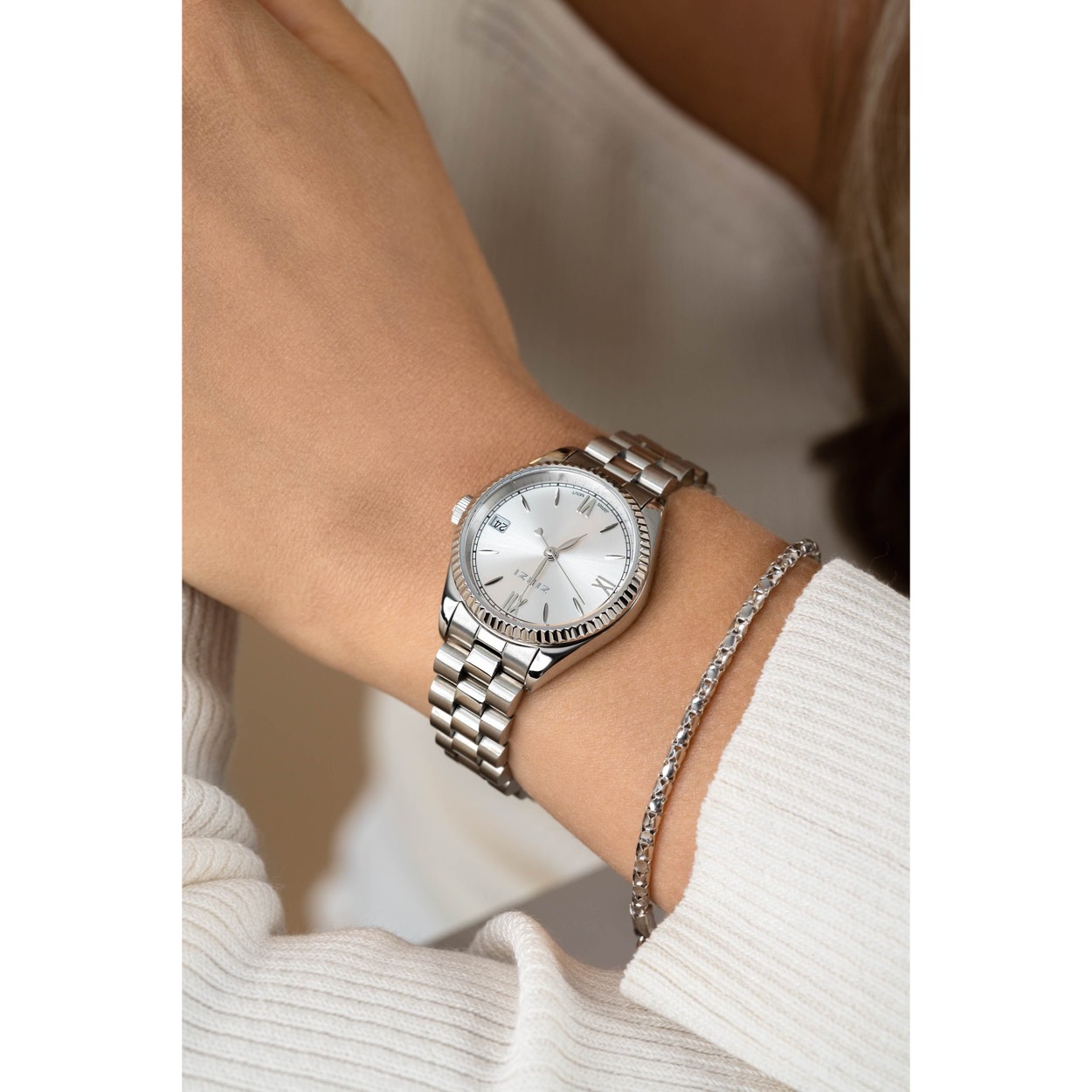 De ICONIC watch van ZINZI heeft een herkenbaar tijdloos ontwerp en een subtiel formaat van 30mm. Voorzien van een opvallende zilverkleurige gekartelde rand rondom het glas, dat zorgt voor een schitterende luxueuze uitstraling. Het dameshorloge heeft een zilverkleurige 'sunray' wijzerplaat met Romeinse cijfers, datum met dag-aanduiding en een stoere stalen band met chique clip-sluiting. Leuk detail: de seconde wijzer met een subtiel hartje. Ook 5atm waterbestendig (tegen regen en spatwater) en met sterk mineraal glas.