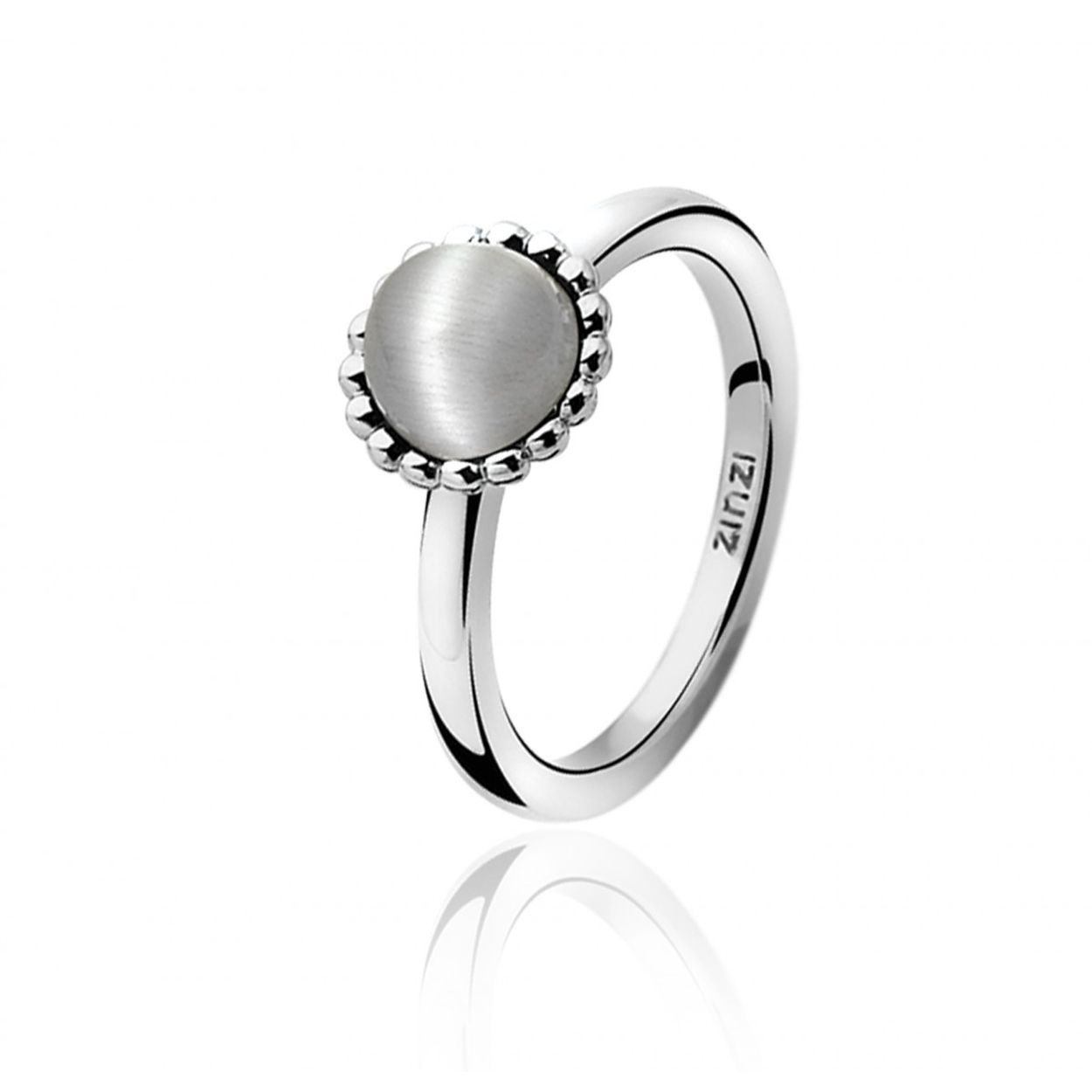 ZINZI smalle zilveren ring met grijze cateye omlijst met bolletjes. Vervaardigd van eerste gehalte zilver (925) en met extra rodiumlaag voor een langdurige glans.